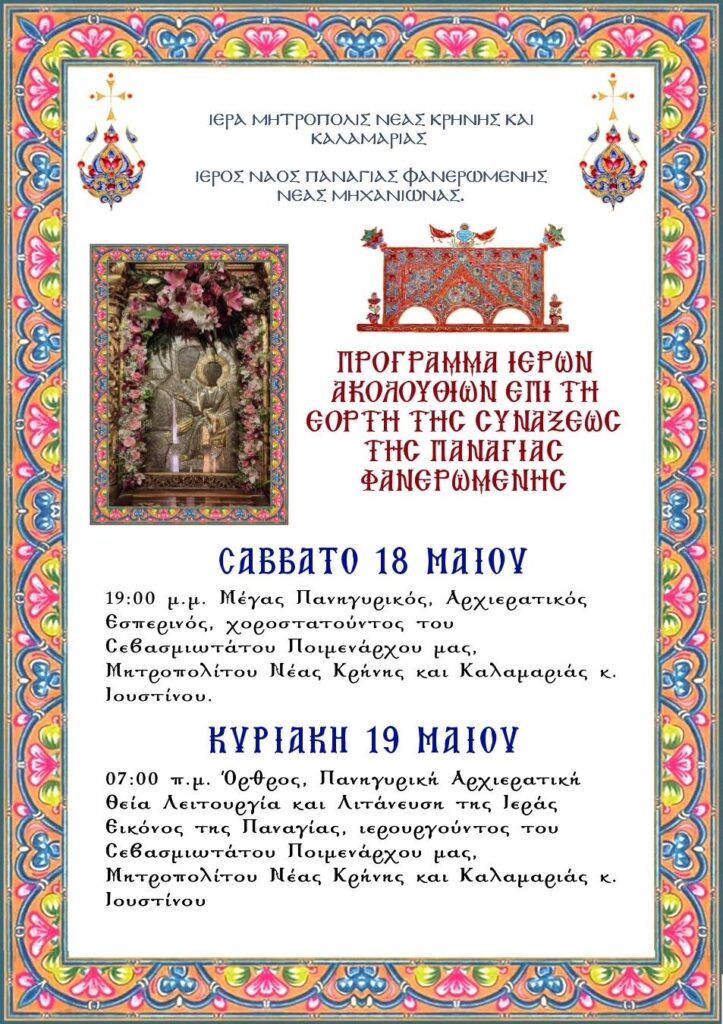 15 Μάι Πρόγραμμα πανηγύρεως Συνάξεως Ιεράς Εικόνος Παναγίας Φανερωμένης στον Ι.Ν. Παναγίας Φανερωμένης Νέας Μηχανιώνας