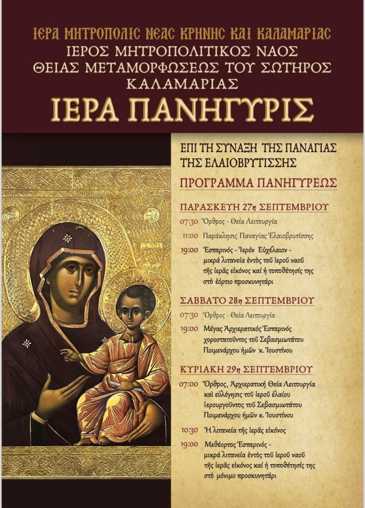 Εκ της Ιεράς Μητροπόλεως ανακοινώνεται ότι αύριο, Κυριακή 29 Σεπτεμβρίου ε.ε., ο Σεβασμιώτατος Ποιμενάρχης κ. Ιουστίνος, κατά τη διάρκεια της Πανηγυρικής Θείας Λειτουργίας επί τη εορτή της Συνάξεως της Ιεράς Εικόνος της Παναγίας της Ελαιοβρυτίσσης στον Ιερό Μητροπολιτικό Ναό Μεταμορφώσεως του Σωτήρος Καλαμαριάς, θα τελέσει την εις Διάκονον Χειροτονία του Μοναχού π. Βησσαρίωνος.