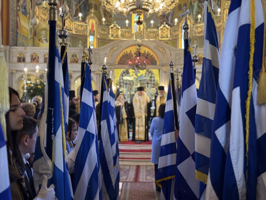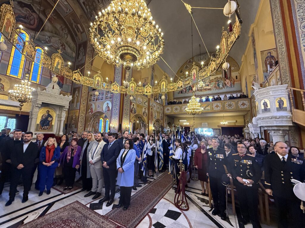 Περαιωθείσης της Θείας Λειτουργίας, τελέστηκε η επίσημη πανηγυρική Δοξολογία για την Εθνική εορτή, παρουσία των πολιτικών και στρατιωτικών αρχών του τόπου και ακολούθησε η κατάθεση στεφάνου από τον Σεβασμιώτατο Ποιμενάρχη στην προτομή του Αρχηγέτου της Ελληνικής Επαναστάσεως, Παλαιών Πατρών Γερμανού, η οποία κοσμεί τον αύλειο χώρο του Ιερού Ναού.