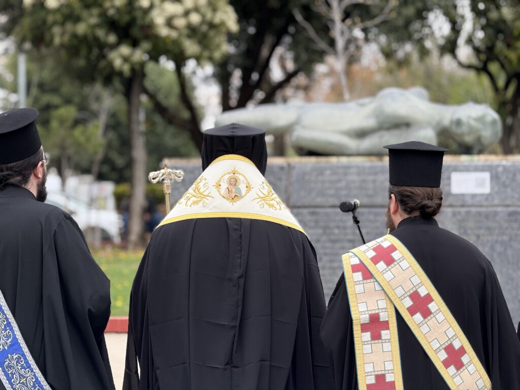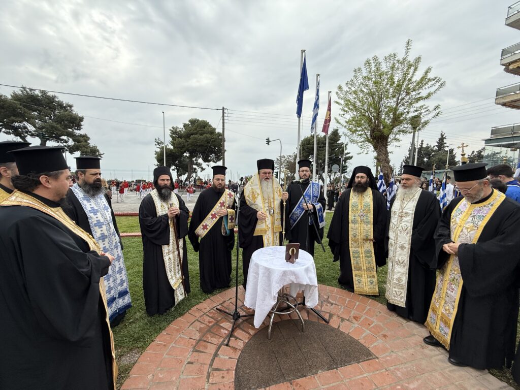 Ακολούθως, Κλήρος και λαός μετέβησαν στο μνημείο πεσόντων στην Πλατεία Σκρα, όπου τελέστηκε Αρχιερατική Επιμνημόσυνη Δέηση και ακολούθησε παρέλαση στην παρακείμενη παραλιακή οδό, στην οποία παρέστη ο Σεβασμιώτατος με τον Ιερό Κλήρο.