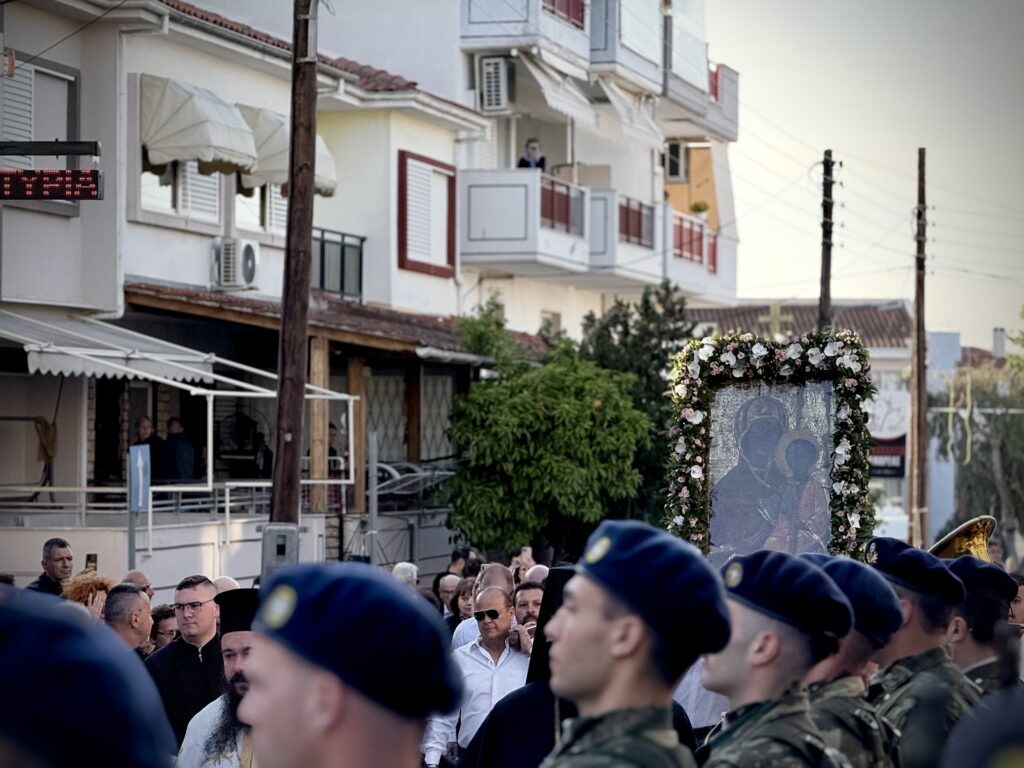 Την Ιερά Εικόνα υποδέχθηκαν ο οικείος Ποιμενάρχης κ. Ιουστίνος, πλαισιούμενος από τους προσκεκλημένους, επί τούτου, Αρχιερείς, Μητροπολίτη Μαρωνείας και Κομοτηνής κ. Παντελεήμονα και Επίσκοπο Αλμωπίας κ. Στέφανο, ο Καθηγούμενος της Ιεράς Μονής Παναχράντου Νέας Ιωνίας κ. Βασίλειος Παλιούρας, δεκάδες ιερείς και διάκονοι, εκπρόσωποι των Ενόπλων Δυνάμεων και των Σωμάτων Ασφαλείας, της τοπικής Αυτοδιοίκησης, Προσφυγικών Συλλόγων, Σχολείων και λοιπών φορέων και ως αναφέραμε ήδη χιλιάδες πιστού λαού.