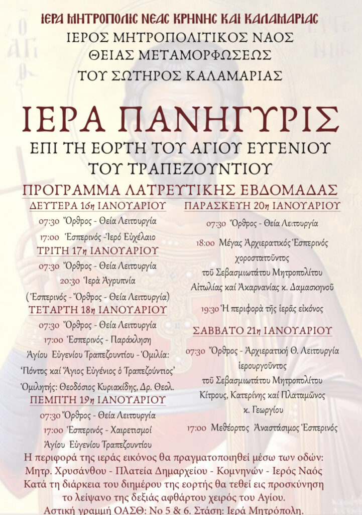 Πρόγραμμα πανηγύρεως εορτής Αγίου Ευγενίου του Τραπεζουντίου στον Ι.Μ.Ν. Μεταμορφώσεως του Σωτήρος Καλαμαριάς