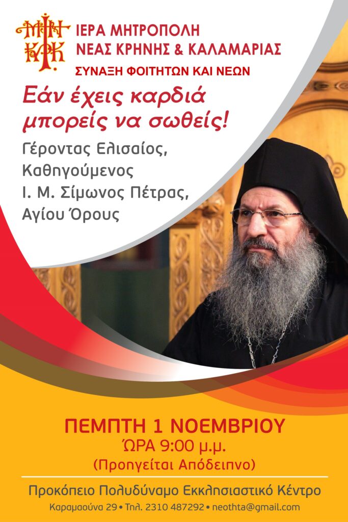 Ανακοινώνεται από την Ιερά Μητρόπολη ότι στη Σύναξη Φοιτητών και Νέων θα ομιλήσει ο Γέροντας Ελισαίος, Καθηγούμενος της Ι. Μ. Σίμωνος Πέτρας, Αγίου Όρους.