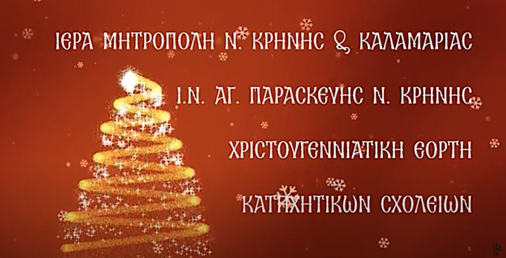Την Πέμπτη 23 Δεκεμβρίου 2021 και ώρα 8 μ.μ. μέσω της διαδικτυακής πλατφόρμας ZOOM προβλήθηκε η Χριστουγεννιάτικη Εορτή των Κατηχητικών σχολείων του Ιερού Ναού Αγίας Παρασκευής Νέας Κρήνης.