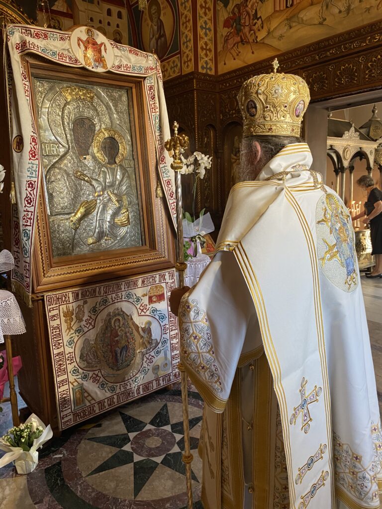 Στις 23 Αυγούστου, κυριώνυμο ημέρα της εορτής της Αποδόσεως της Κοιμήσεως της Υπεραγίας Θεοτόκου, προεστώς της λατρευτικής σύναξης ήταν ο Πολυσέβαστος Μητροπολίτης Μετρών και Αθύρων κ. Δημήτριος, ο οποίος κήρυξε και τον θείο λόγο.