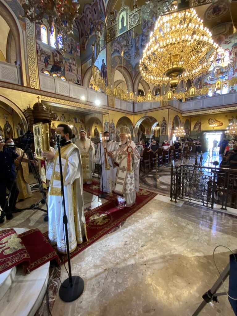 Στο τέλος του Εσπερινού, λόγω των περιοριστικών μέτρων προστασίας της υγείας, η Ιερά Εικόνα της Παναγίας λιτανεύθηκε εντός του Ιερού Ναού.