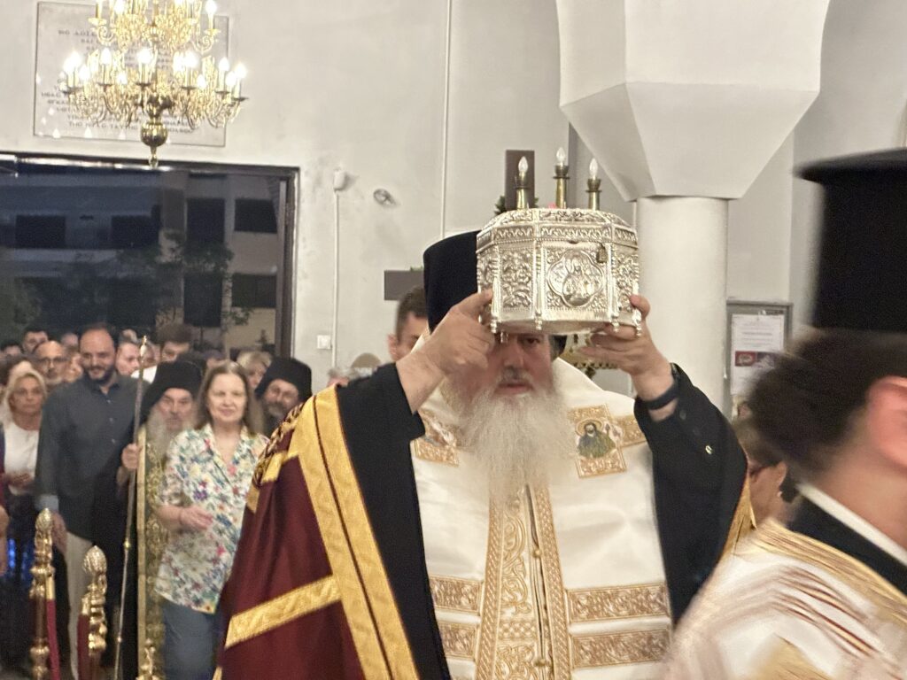 Της υποδοχής ακολούθησε Πανηγυρική Δοξολογία, στο τέλος της οποίας ο προϊστάμενος του Ναού Αρχιμανδρίτης π. Βαρθολομαίος Κωτούλας, εξέφρασε τις ευχαριστίες του προς τον Σεβασμιώτατο, αλλά και προς τον Γέροντα Ευδόκιμο, για την ακώλυτη ανταπόκριση στο αίτημα της ενορίας.