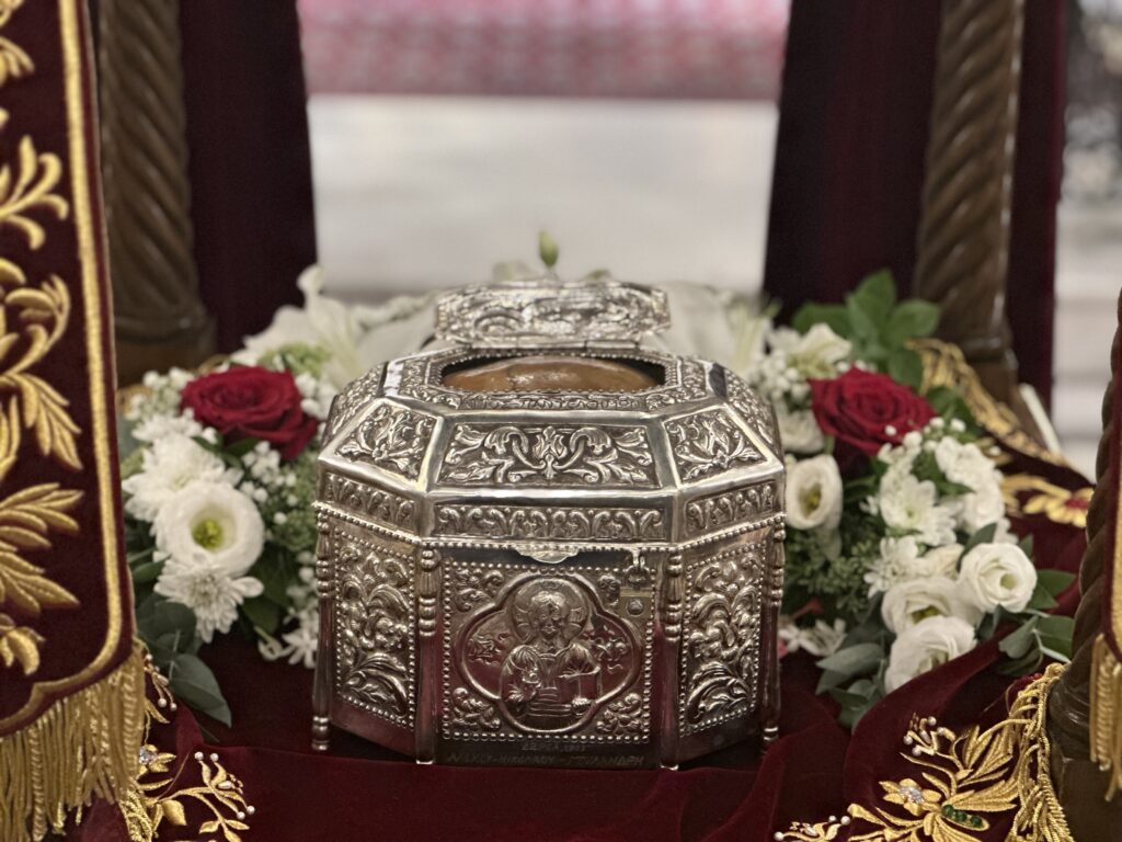 Να σημειωθεί, τέλος, ότι το ιερό λείψανο θα παραμείνει στο Ναό μέχρι και την Δευτέρα 2 Οκτωβρίου, με πλούσιο λατρευτικό πρόγραμμα, δίνοντας, έτσι, την αφορμή στον λαό του Θεού να λάβει την ευλογία του Αγίου.