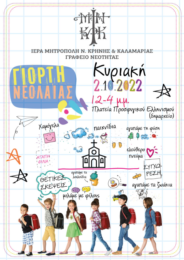 Σας περιμένουμε όλες και όλους στην γιορτή νεολαίας, που διοργανώνει η Ιερά Μητρόπολη Νέας Κρήνης και Καλαμαριάς την Κυριακή 2 Οκτωβρίου 2022, στην Πλατεία Προσφυγικού Ελληνισμού.