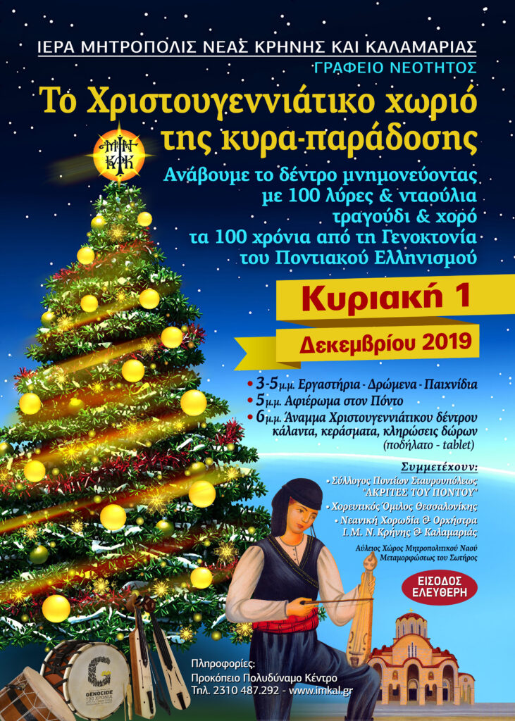 Την Κυριακή, 1 Δεκεμβρίου και ώρα 3:00 μ.μ., με τις ευλογίες του Σεβασμιωτάτου Ποιμενάρχου μας κ. Ιουστίνου, ανοίγει και φέτος τις πύλες του το Χριστουγεννιάτικο χωριό της Κυρά – Παράδοσης στον αύλειο χώρο του Μητροπολιτικού Ναού Μεταμορφώσεως του Σωτήρος Καλαμαριάς με ένα ειδικό αφιέρωμα: «Ανάβουμε το Χριστουγεννιάτικο δέντρο μνημονεύοντας με 100 λύρες και νταούλια, τραγούδι και χορό τα 100 χρόνια από τη Γενοκτονία του Ποντιακού Ελληνισμού».