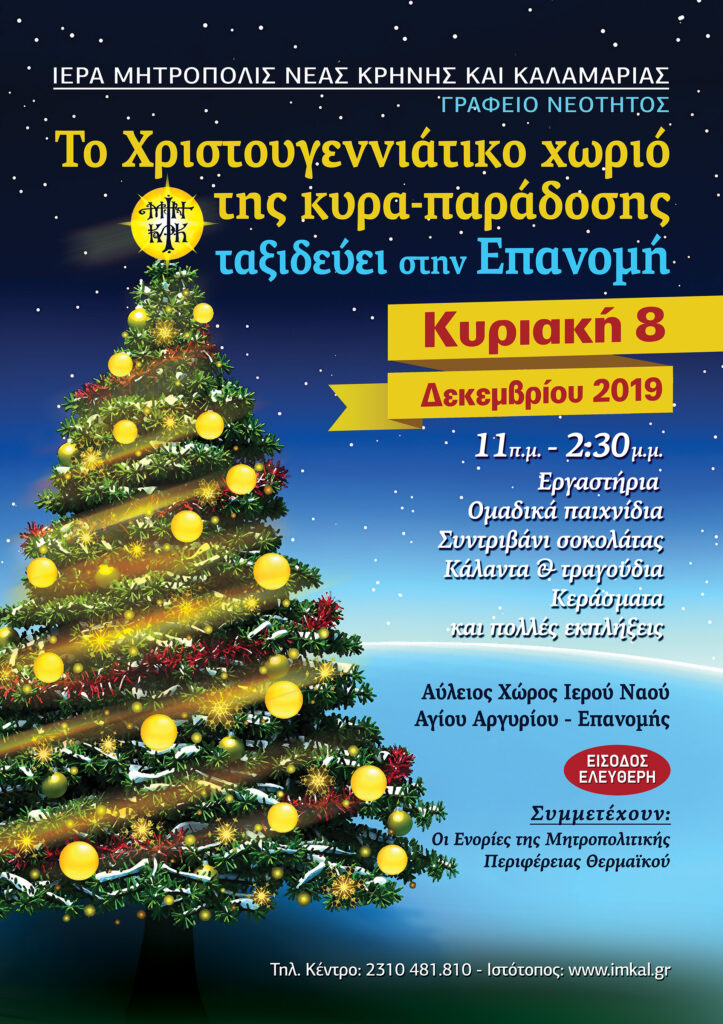 Το Χριστουγεννιάτικο χωριό της Κυρά – Παράδοσης, με τις ευλογίες του Σεβασμιωτάτου Ποιμενάρχου μας, κ. Ιουστίνου, μεταφέρεται, όπως κάθε χρόνο, και ανοίγει τις πύλες του, την Κυριακή 8 Δεκεμβρίου 2019 από τις 11 π.μ.- 2:30 μ.μ. στον Αύλειο χώρο του Ιερού Ναού Αγίου Αργυρίου στην Επανομή.