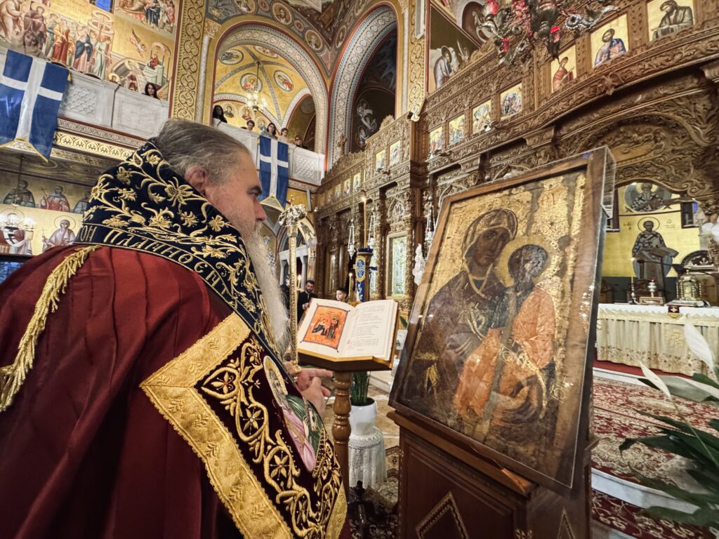 Οι τέσσερις στάσεις των Χαιρετισμών εψάλησαν ενώπιον του θαυματουργού ιερού εικονίσματος της Παναγίας Φανερωμένης, η οποία μεταφέρθη λιτανευτικώς από το θρόνο Της στον σολέα του Ναού.