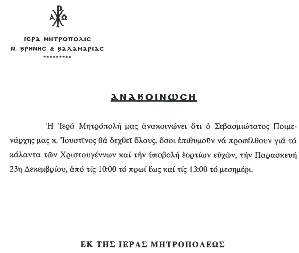 Ευχές και Χριστουγεννιάτικα κάλαντα στον Σεβασμιώτατο