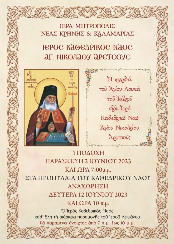 Πρόγραμμα υποδοχής της καρδιάς του Αγίου Λουκά Συμφερουπόλεως στον Ι.Κ.Ν. Αγίου Νικολάου Καλαμαριάς