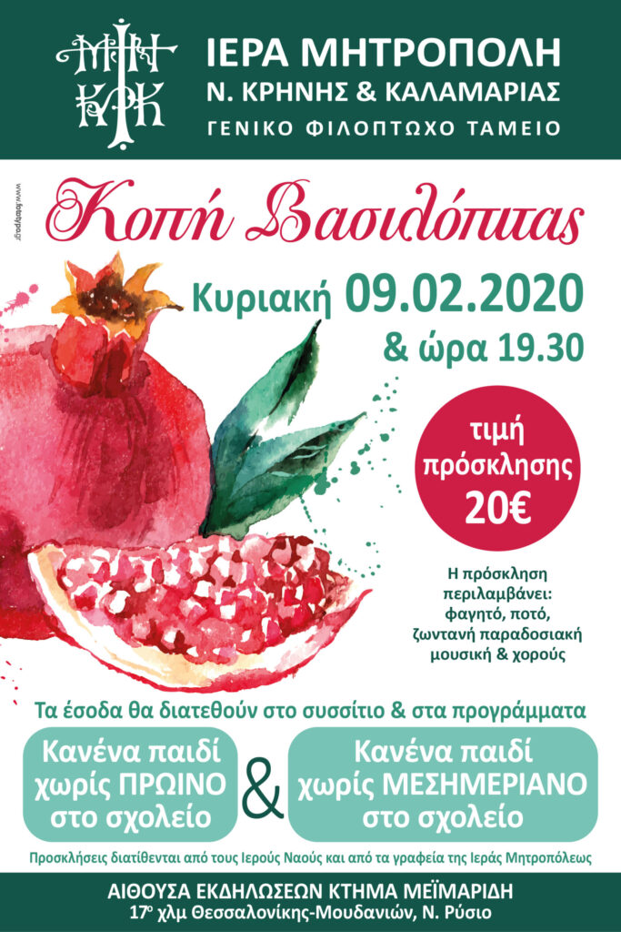 Η Ιερά Μητρόπολη Νέας Κρήνης και Καλαμαριάς και το Γενικό Φιλόπτωχο Ταμείο σας προσκαλούν, με χαρά, να περαστείτε στην κοπή της Βασιλόπιτας.