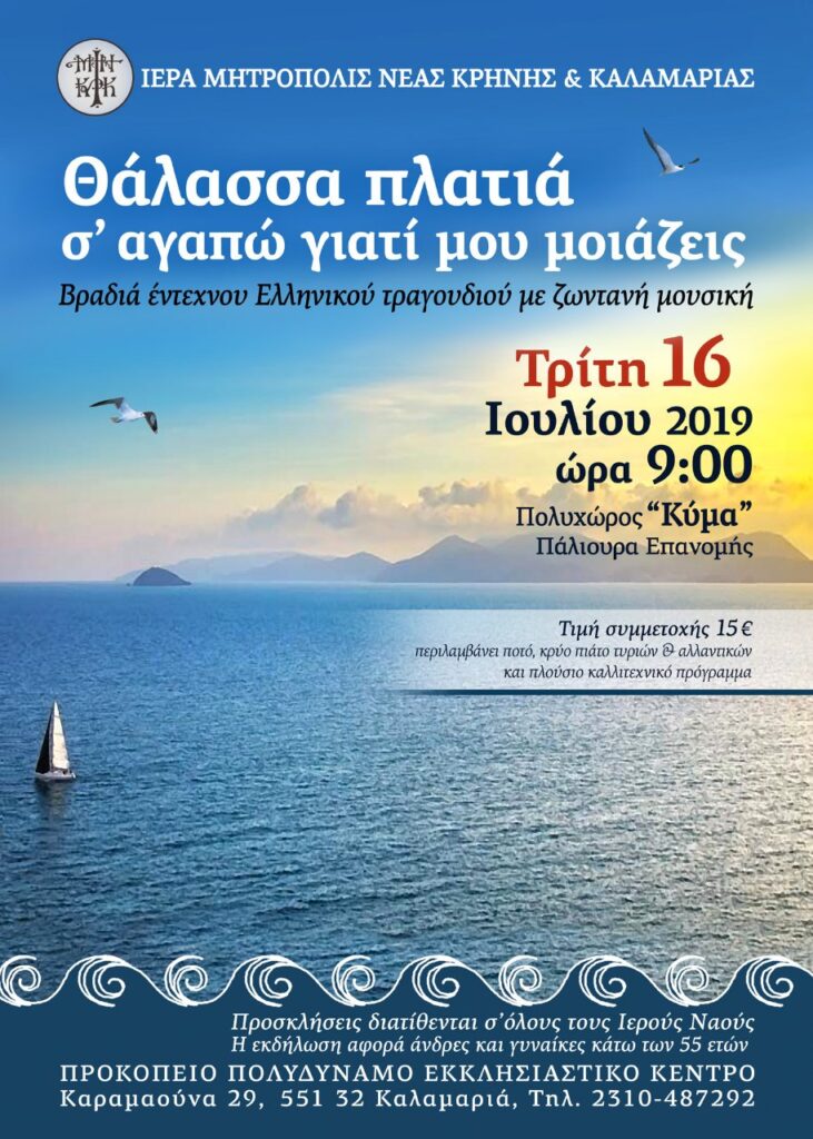 Από την Ιερά Μητρόπολη Νέας Κρήνης και Καλαμαριάς ανακοινώνεται ότι αναβάλλεται λόγω πένθους για τον τραγικό χαμό συνανθρώπων μας απο την πρόσφατη σφοδρή κακοκαιρία στη Χαλκιδική, αλλά και λόγω επικειμένων δυσμενών καιρικών φαινομένων, η Φιλανθρωπική Εκδήλωση- Βραδιά Έντεχνου Τραγουδιού στον Πολυχώρο “Κύμα” στην Επανομή.