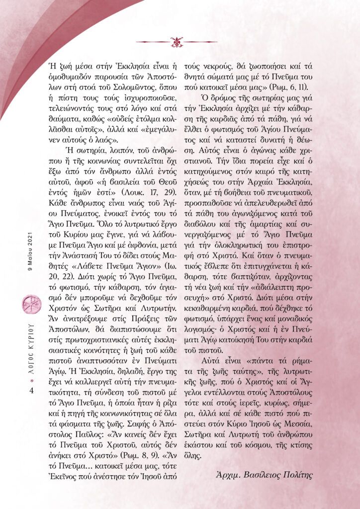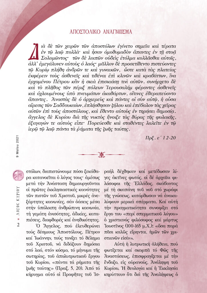 “Λόγος Κυρίου”-09/05/2021-«Λαλεῖτε τὰ ῥήματα τῆς Ζωῆς ταύτης». Δηλαδή;