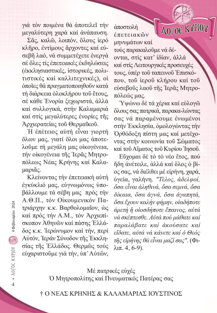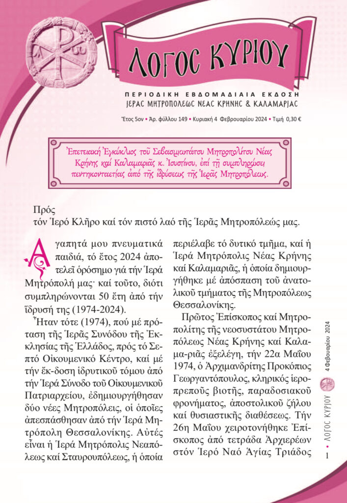 “Λόγος Κυρίου”-04/02/2024-Επετειακή Εγκύκλιος του Σεβασμιωτάτου Μητροπολίτου Νέας Κρήνης και Καλαμαριάς κ. Ιουστίνου, επί τη συμπληρώσει πεντηκονταετίας από της ιδρυσεως της Ιεράς Μητροπόλεως