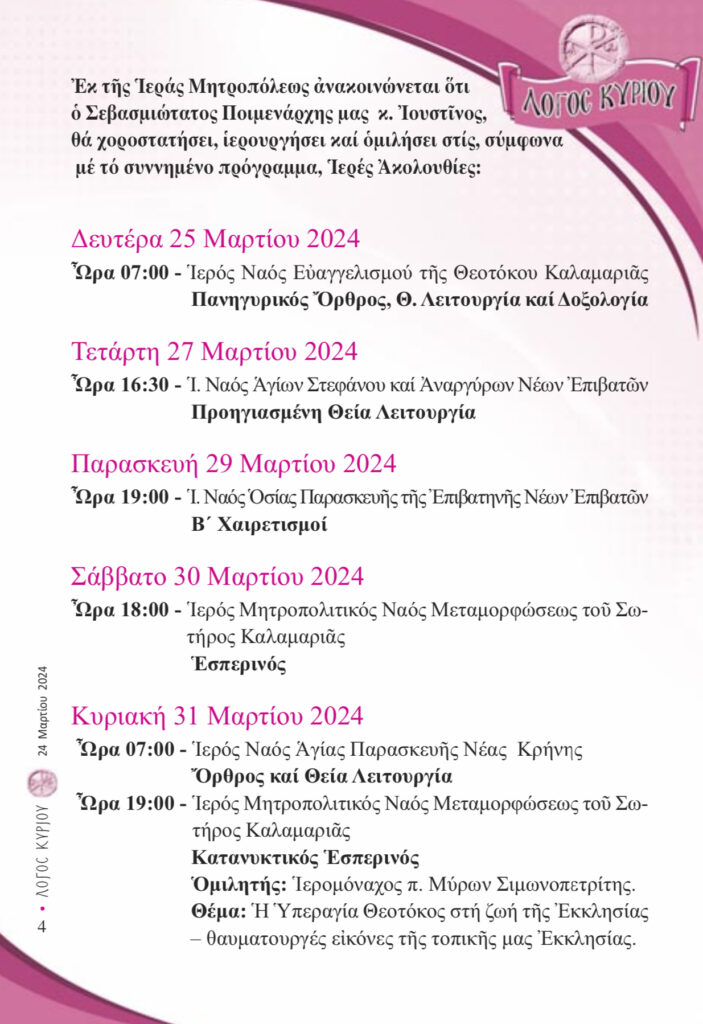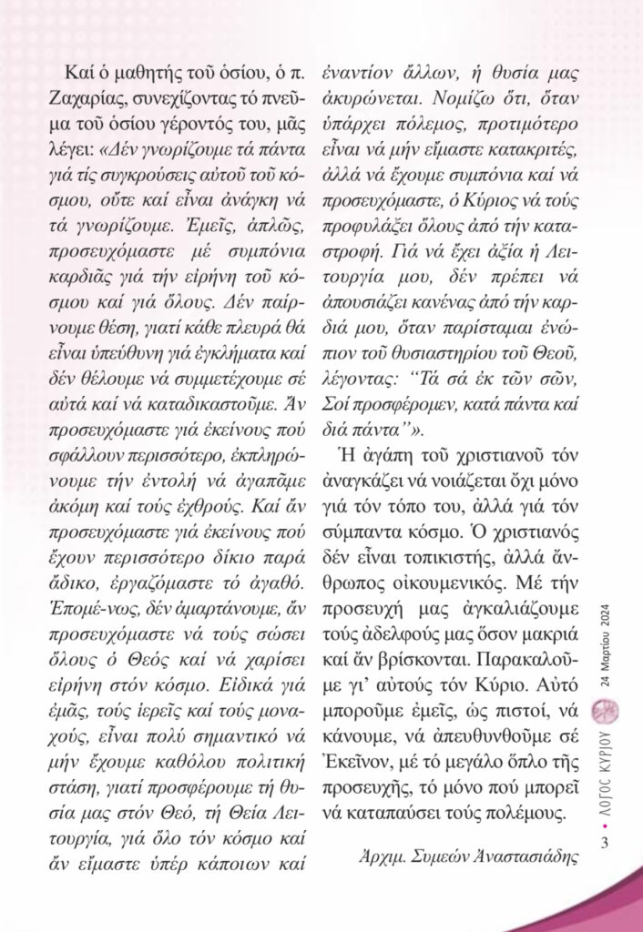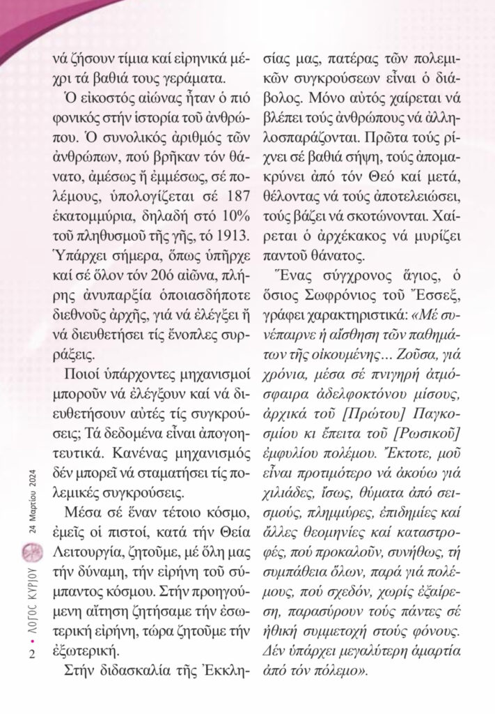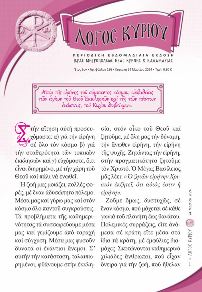 “Λόγος Κυρίου”-24/03/2024-«Ὑπὲρ τῆς εἰρήνης τοῦ σύμπαντος κόσμου, εὐσταθείας τῶν ἁγίων τοῦ Θεοῦ Ἐκκλησιῶν καὶ τῆς τῶν πάντων ἑνώσεως, τοῦ Κυρίου δεηθῶμεν.»