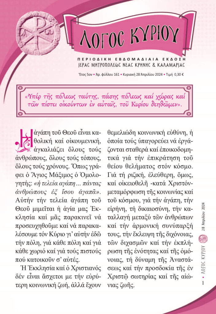 “Λόγος Κυρίου”-28/04/2024-«Ὑπὲρ τῆς πόλεως ταύτης, πάσης πόλεως καί χώρας καί τῶν πίστει οἰκούντων ἐν αὐταῖς, τοῦ Κυρίου δεηθῶµεν»