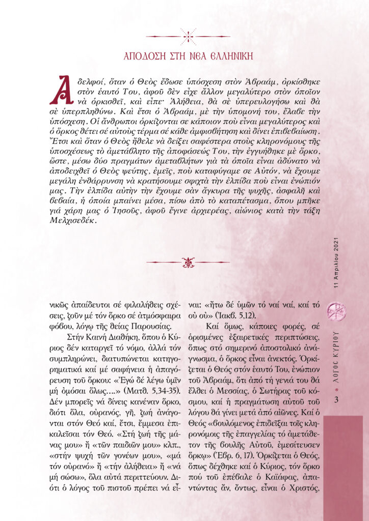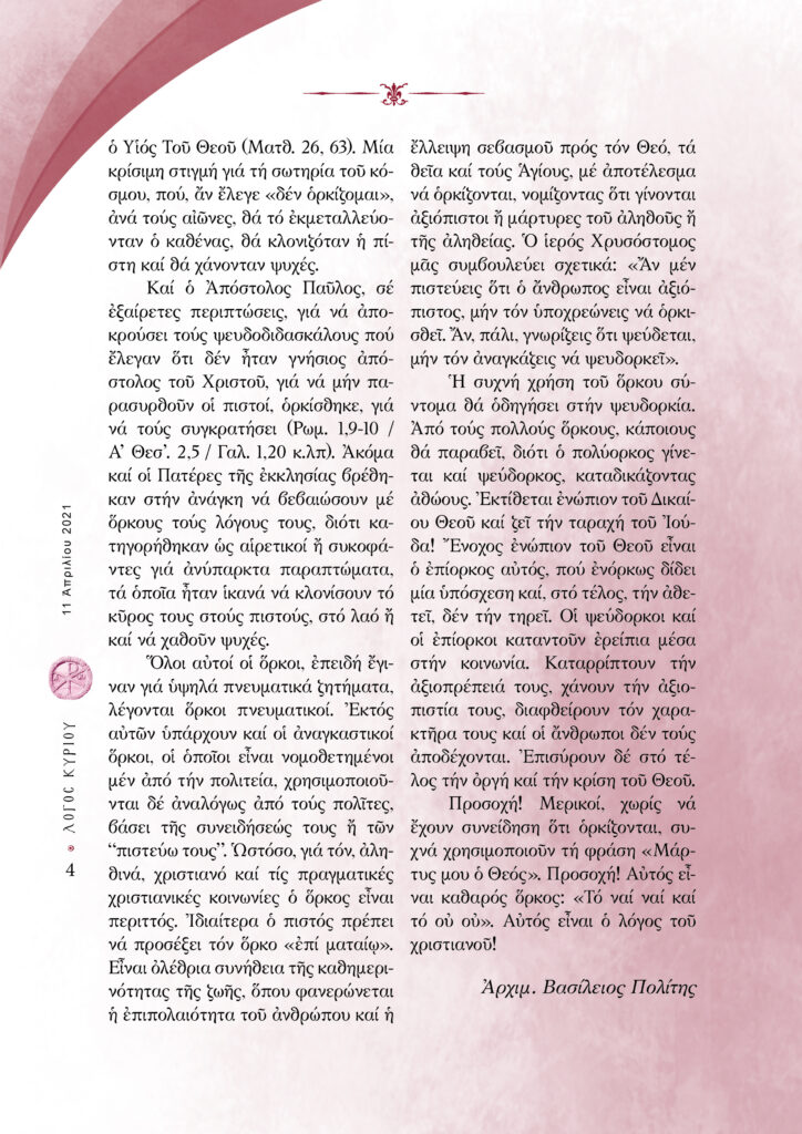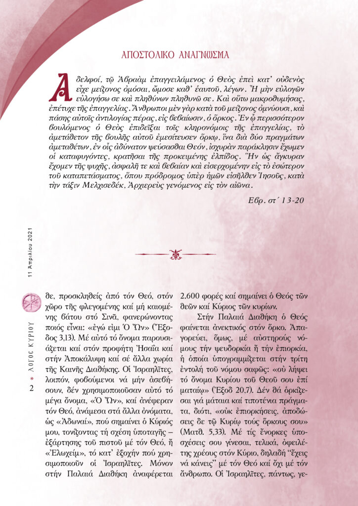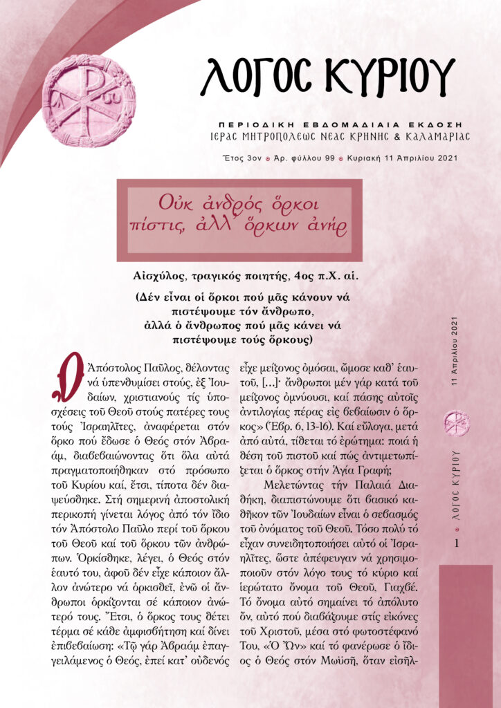 “Λόγος Κυρίου”-11/04/2021-Οὐκ ἀνδρός ὅρκοι πίστις, ἀλλ᾿ ὅρκων ἀνήρ
