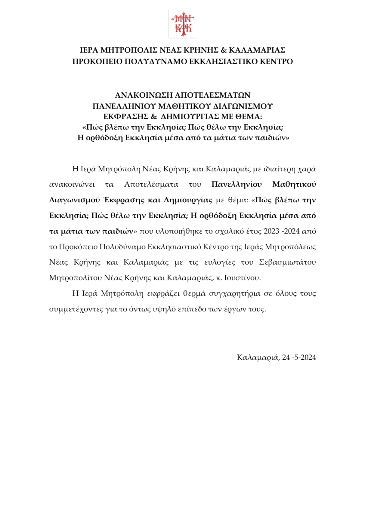 Αποτελέσματα πανελληνίου μαθητικού διαγωνισμού έκφρασης και δημιουργίας με θέμα: «Πώς βλέπω την Εκκλησία; Πώς θέλω την Εκκλησία; Η ορθόδοξη Εκκλησία μέσα από τα μάτια των παιδιών» Διαβάστε περισσότερα 04/06/2024