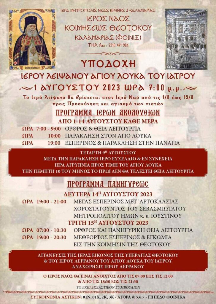 Πρόγραμμα πανηγύρεως και υποδοχής Ιερού Λειψάνου Αγίου Λουκά του ιατρού στον Ι.Ν. Κοιμήσεως της Θεοτόκου Καλαμαριάς