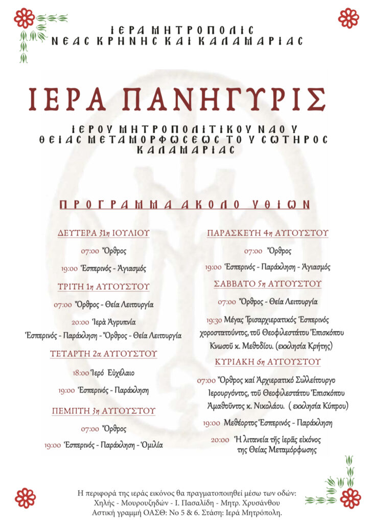 Πρόγραμμα πανηγύρεως Ι.Μ.Ν. Μεταμορφώσεως του Σωτήρος Καλαμαριάς