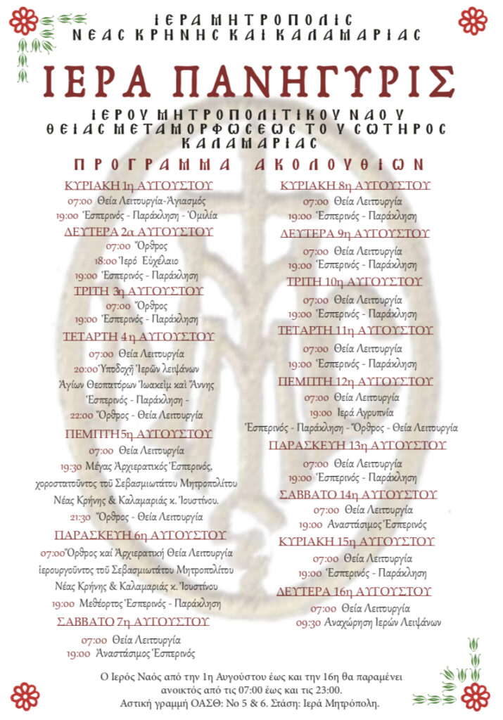 Πρόγραμμα πανηγύρεως και Υποδοχής Ιερών Λειψάνων Αγίων Ιωακείμ και Άννης Ι.Μ.Ν. Μεταμορφώσεως του Σωτήρος Καλαμαριάς
