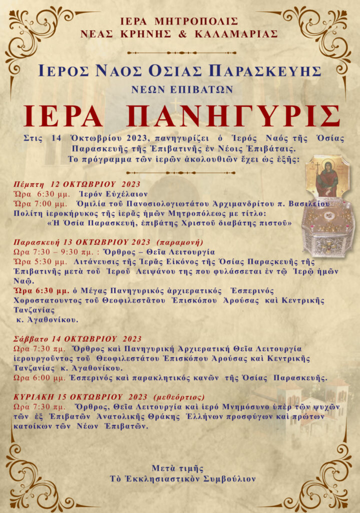 Πρόγραμμα πανηγύρεως Ι.Ν. Οσίας Παρασκευής της Επιβατηνής Νέων Επιβατών