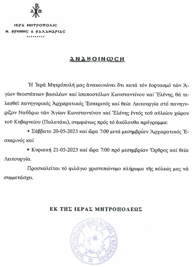 Πρόγραμμα πανηγύρεως Ι.Μ.Π. Αγίων Κωνσταντίνου και Ελένης Κυβερνείου (Παλατάκι) Καλαμαριάς
