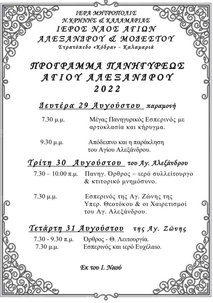 Πρόγραμμα πανηγύρεως Ι.Μ.Π. Αγίου Αλεξάνδρου Στρατοπέδου «Κόδρα»