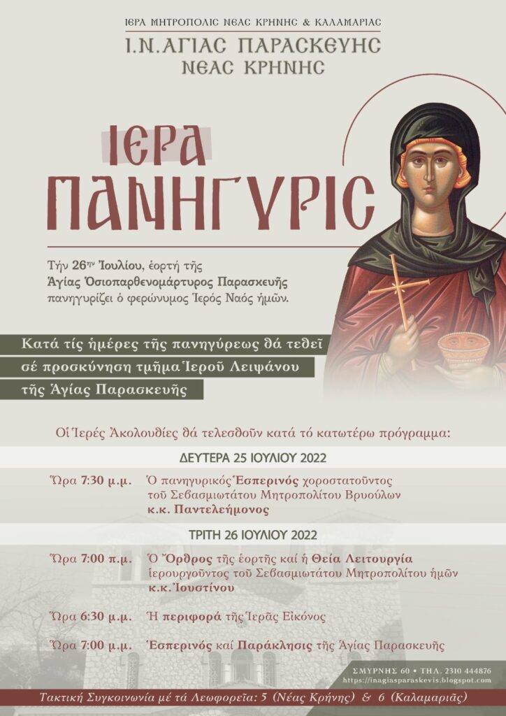 Πρόγραμμα πανηγύρεως Ι.Ν. Αγίας Παρασκευής Νέας Κρήνης