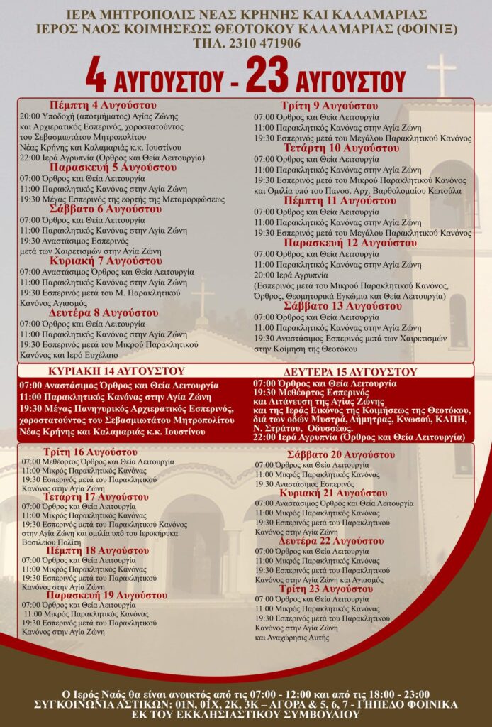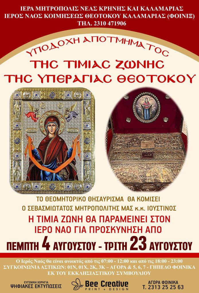 Πρόγραμμα υποδοχής αποτμήματος Αγίας Ζώνης και πανηγύρεως Ι.Ν. Κοιμήσεως της Θεοτόκου Καλαμαριάς