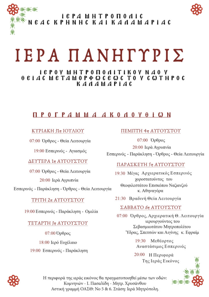 Πρόγραμμα πανηγύρεως Ι.Μ.Ν. Μεταμορφώσεως του Σωτήρος Καλαμαριάς