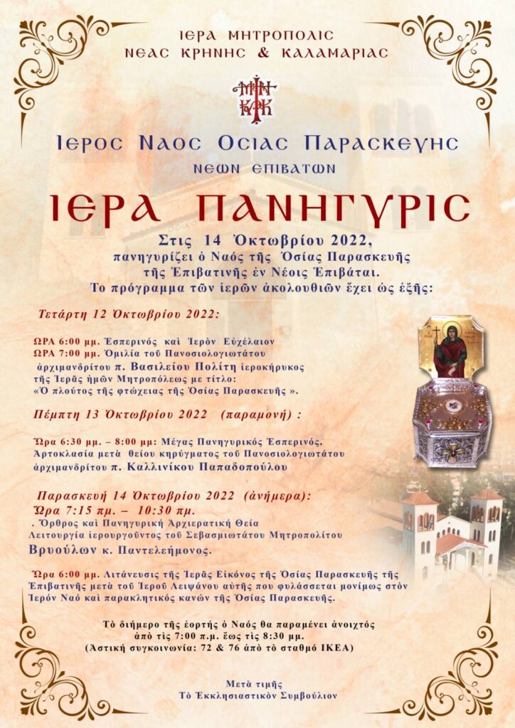 Πρόγραμμα πανηγύρεως Ι.Ν. Οσίας Παρασκευής της Επιβατηνής Νέων Επιβατών