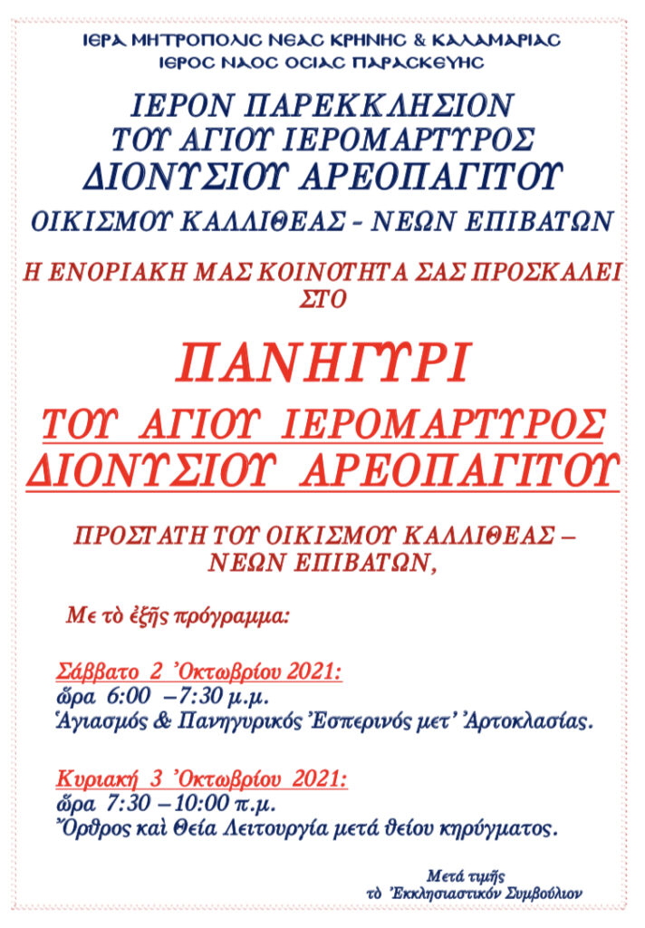 Πρόγραμμα πανηγύρεως Ι.Π. Αγίου Διονυσίου Αρειπαγίτου Νέων Επιβατών (Οικισμός Καλλιθέας)