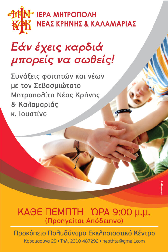 Από την Ιερά Μητρόπολη ανακοινώνεται, ότι ξεκίνησαν οι συναντήσεις φοιτητών και νέων, κάθε Πέμπτη στις 9 μ.μ (προηγείται Απόδειπνο) στο “Προκόπειο” Πολυδύναμο Εκκλησιαστικό κέντρο.