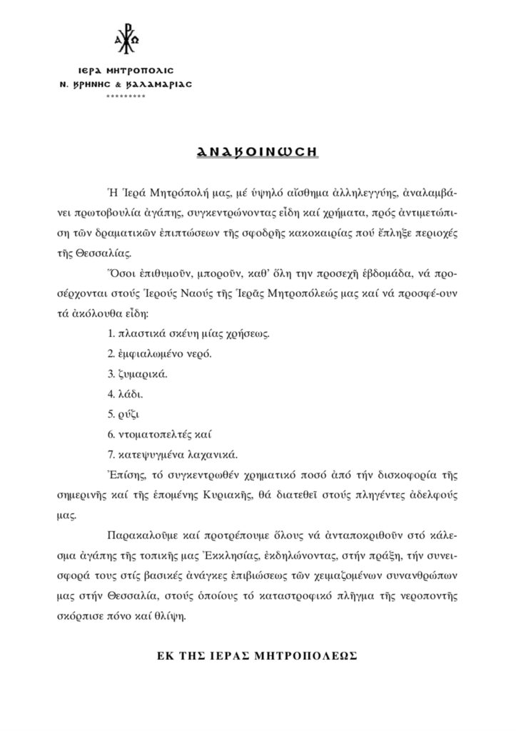 Συγκέντρωση μέχρι την Κυριακή 17/09 στους Ιερούς Ναούς της Ιεράς Μητροπόλεώς μας