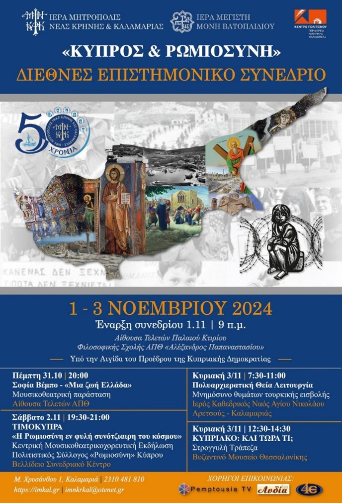Το Διεθνές Συνέδριο, που διοργανώθηκε υπό την αιγίδα του προέδρου της Κυπριακής Δημοκρατίας είχε τον τίτλο Κύπρος και Ρωμιωσύνη και πραγματοποιήθηκε από 1 έως 3 Νοεμβρίου στην Αίθουσα Τελετών του Παλαιού Κτηρίου της Φιλοσοφικής Σχολής του ΑΠΘ «Αλέξανδρος Παπαναστασίου». Οι εκδηλώσεις συνδιοργανώθηκαν με την Ιερά Μεγίστη Μονή Βατοπαιδίου και το Κέντρο Πολιτισμού της Περιφέρειας Κεντρικής Μακεδονίας. Οι παράλληλες εκδηλώσεις που ξεκίνησαν μια μέρα νωρίτερα περιελάμβαναν τη Μουσικοθεατρικές και χορευτικές παραστάσεις, πολυαρχιερατική θεία λειτουργία και μνημόσυνο των θυμάτων της τουρκικής εισβολής, καθώς και στρογγυλή τράπεζα με τη συμμετοχή του πρώην προέδρου της Ελληνικής Δημοκρατίας κ. Προκόπη Παυλόπουλου καθώς και του πρώην προέδρου της Κυπριακής Βουλής των Αντιπροσώπων κ. Γιαννάκη Ομήρου με θέμα το μέλλον της Κύπρου.