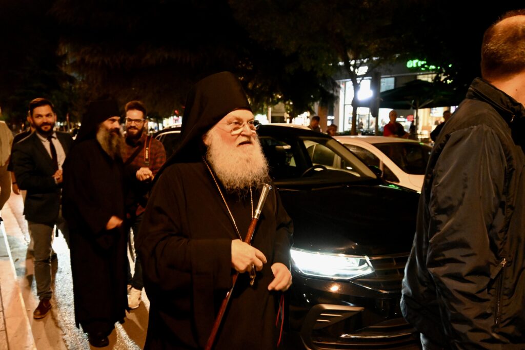 Ο Σεβασμιώτατος Μητροπολίτης Νέας Κρήνης και Καλαμαριάς κ. Ιουστίνος, μαζί με τον ιερό κλήρο, τον ευσεβή λαό, τοπικούς άρχοντες και εκπροσώπους των ενόπλων δυνάμεων, υποδέχτηκε την ιερά εικόνα, όπου προσκόμισε ο Γέροντας Εφραίμ με την συνοδεία του από την Ιερά Μεγίστη Μονή Βατοπαιδίου, Αγίου Όρους.